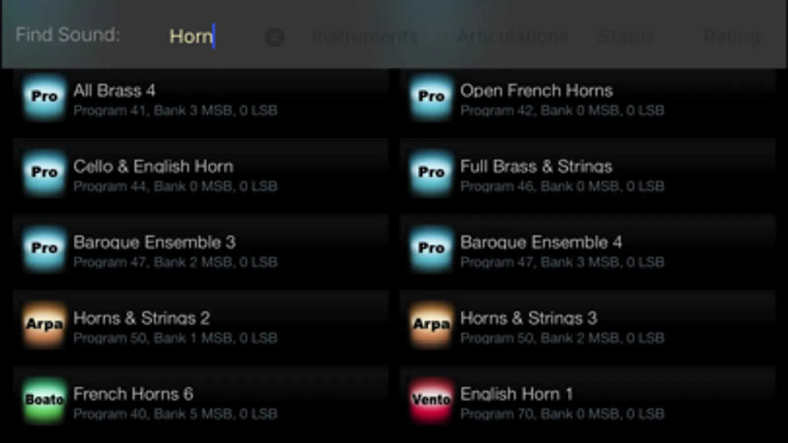 297 additional sounds available as 15 optional in-app purchase sound sets: „Pro-", „Arpa-", „Canto-", „Boato-", „Vento-", „Ottone-", „Voce-", „Varia-", „Perla-", „Aulos-", „Keys-", „Cupra-", „Organ-", „Tosca-" and „Corda Sound Set". You find a detailed sound list & demo videos on our product website.