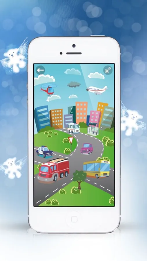 The bustling city scene includes many iconic shapes and features. Interact with the bus stop, ambulance, fire truck, car, police car, city trees, rain, airplane, bus and whirring helicopter.