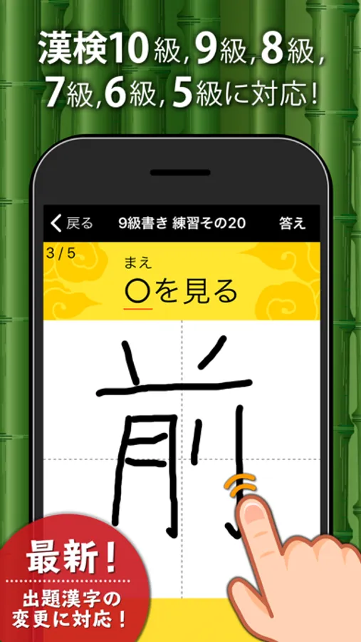 漢字能力検定の10級、9級、8級、7級、6級、5級で出題される全1026漢字の「書き取り」「読み方」などを練習することができます。