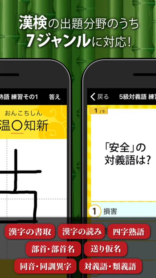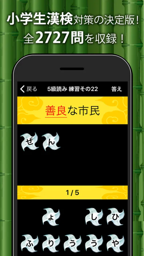 5問1セットの練習問題で漢字を練習し、10問1セットの実力テストで実力を確かめましょう!