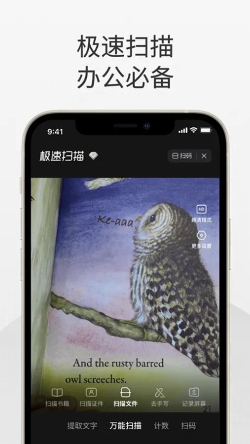 【极速扫描】支持扫描文件、扫描书籍、扫描证件照;支持拍照去手写、提取文字、记录屏幕