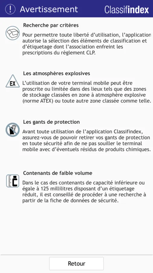 Classifindex délivre un supplément d’informations aux documents de vos fournisseurs. Cet outil vous permet d’identifier rapidement les dangers des produits chimiques à partir des éléments présents sur l’étiquette ou sur la fiche de données de sécurité.