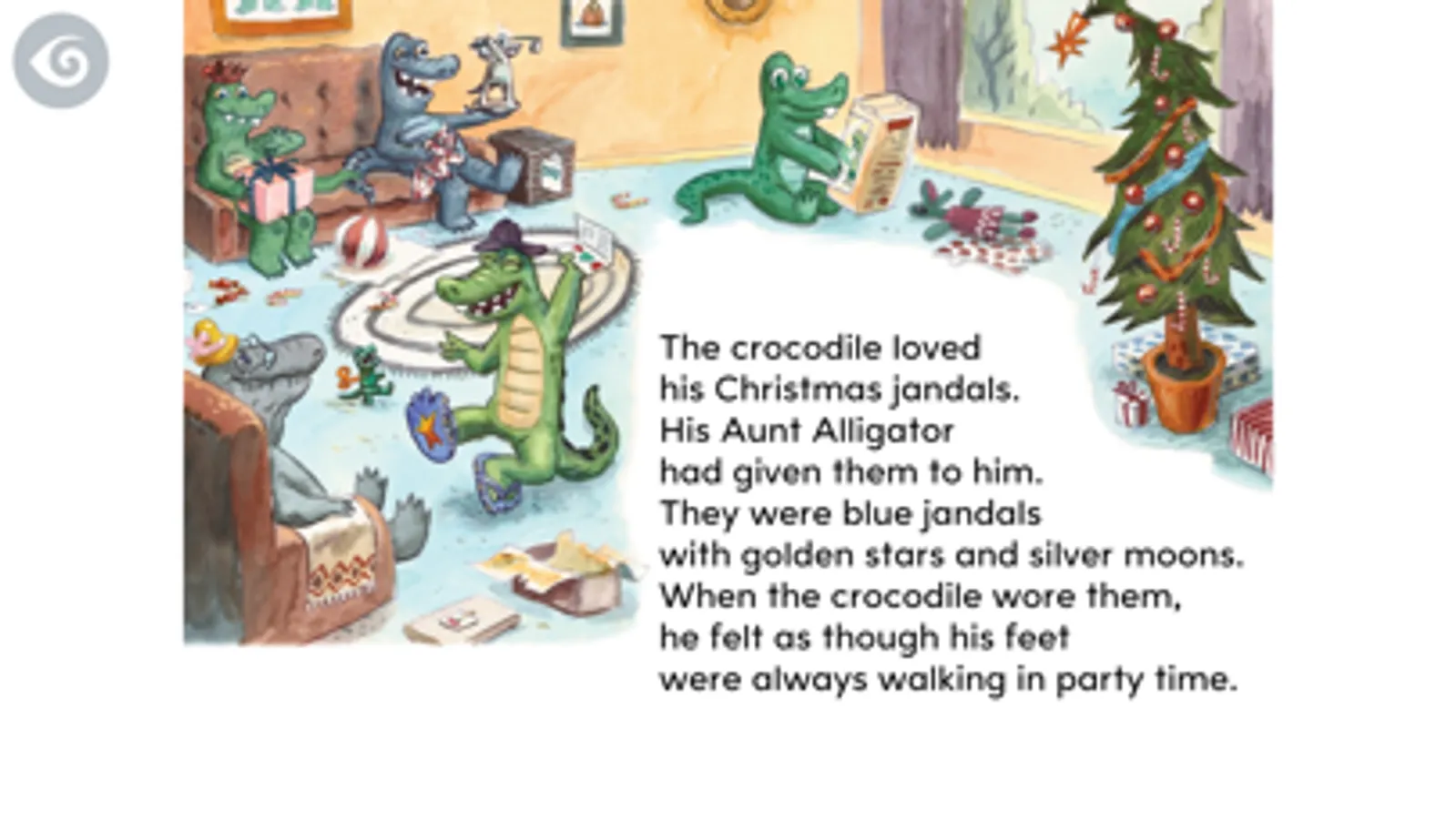 The crocodile loves his new Christmas jandals. But while he is at a beach barbecue, the waves steal away one of his blue jandals and all he can find is a left-foot red jandal. Later in the week, the crocodile wears the odd jandals to a football match. He discovers that he is sitting next to a girl who is wearing his jandal! They are both delighted to have found their missing jandals, and as well as finding his missing jandal, the crocodile is very happy to have found a new friend.
