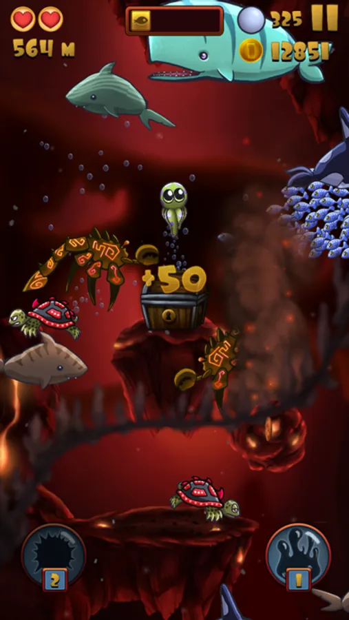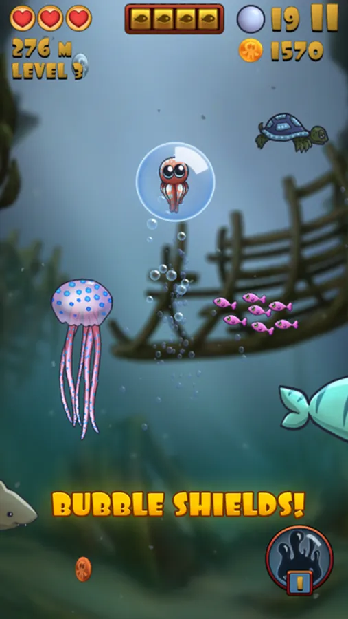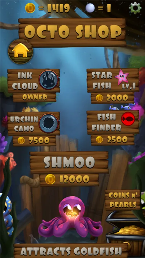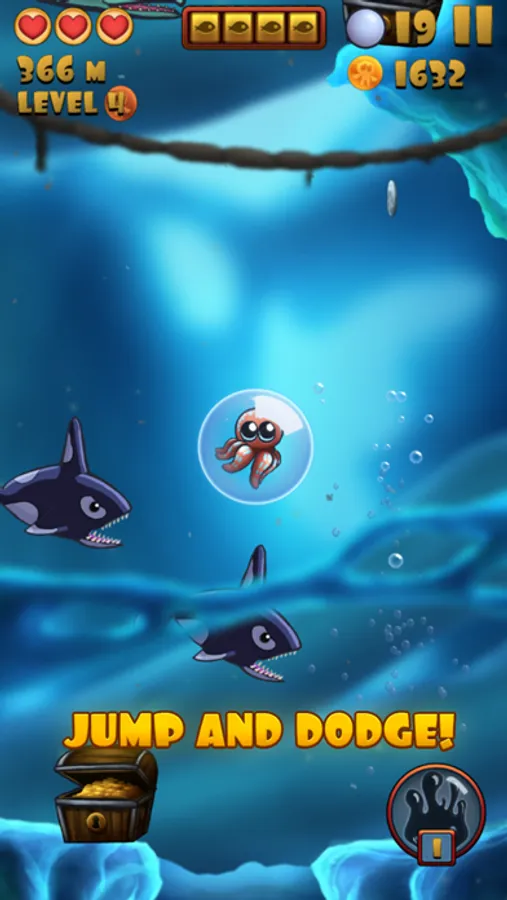 You'll need a little help along the way to make it to the surface. Gold is dropping from Ollie's treasure chest, and you can use it to buy items and upgrades for Chum and his friends! Collect pearls from oysters to jump ahead levels and start with a helping hand!