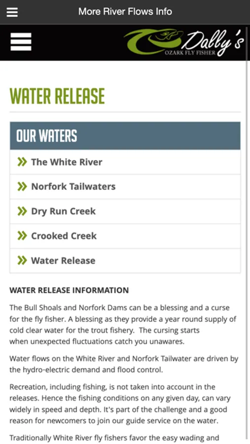 Dally's Ozark Fly Fisher App is designed to put the essential information our fly fishing guides use on a daily basis to find the best fishing, follow the ever-changing water flows and keep an eye on the weather patterns. You can also read our hugely popular blog posts, check on our Facebook updates and track our Instagram feed.