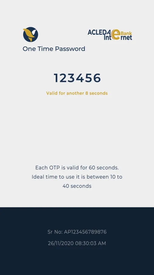 Make your mobile device a convenient, easy-to-use, anytime anywhere Security Token Authenticator. Protect your ACLEDA Internet Banking Account with ACLEDA Bank's OTP Security Token for strong authentication. This app requires a software token for generating one-time passwords (OTPs) for authentication and authorisation of your online transactions. The ACLEDA Bank OTP Security Token 1.2 for your mobile device includes the following: