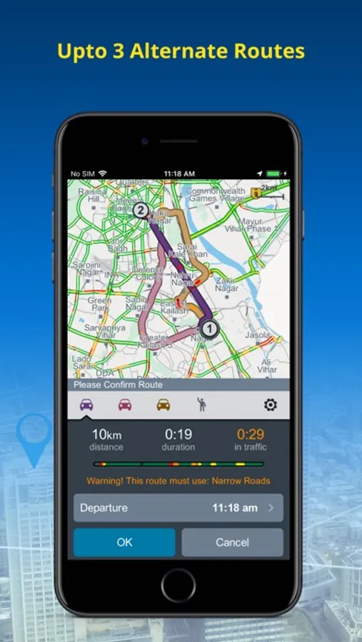 • Get up to 3 alternate driving routes & 1 pedestrian route. The route automatically updates you with Live Traffic (Internet required)