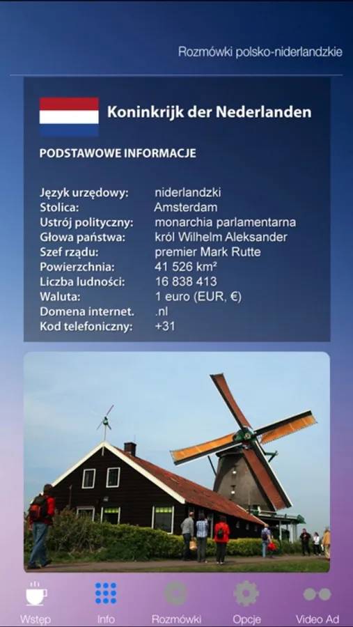 Dodatkowo aplikacja zawiera podstawowe informacje o Holandii.