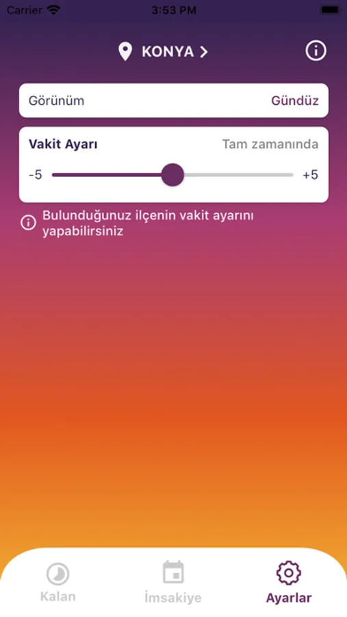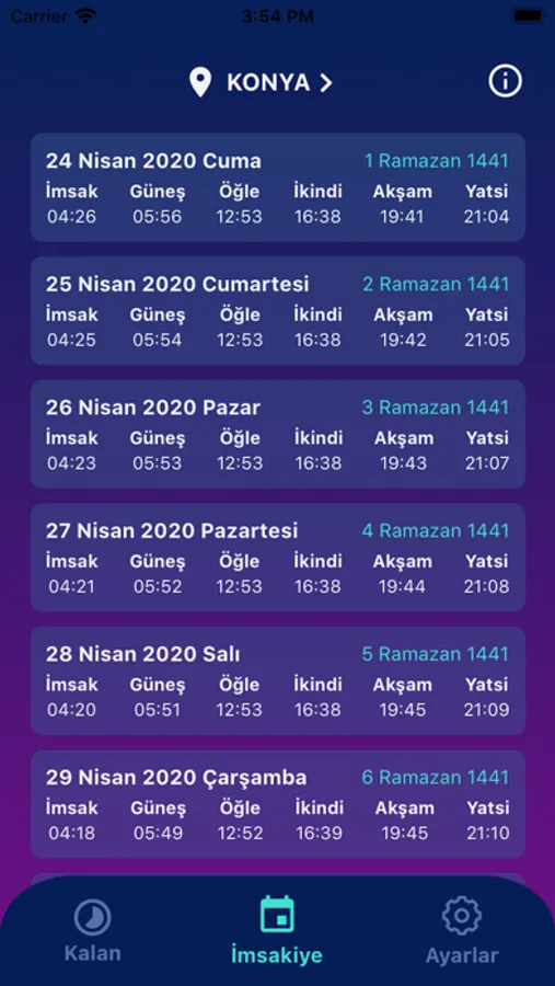 Diyanet İşleri Başkanlığının sunduğu veriler ile çalışan ramazan imsakiyesidir. Ana ekran üzerinde o güne ait vakit bilgileri gösterilir. İstenirse tüm imsakiyeye göz atılabilir.