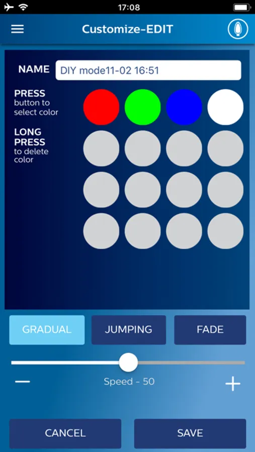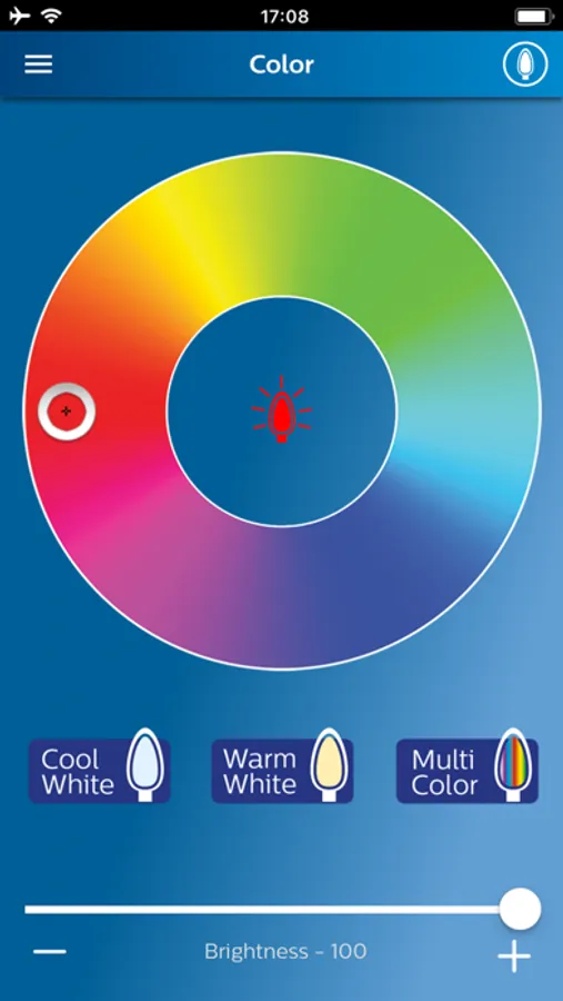 • Choose a color from color wheel or select preset buttons for warm white, cool white or multi lights.