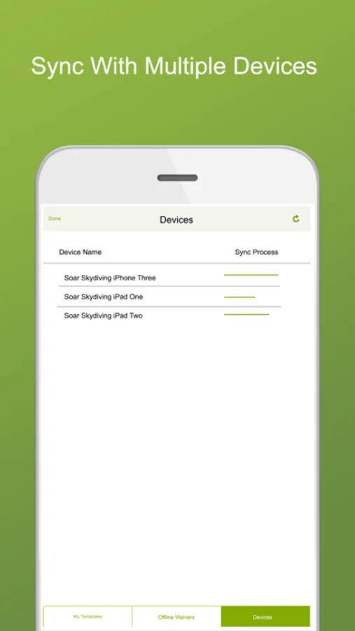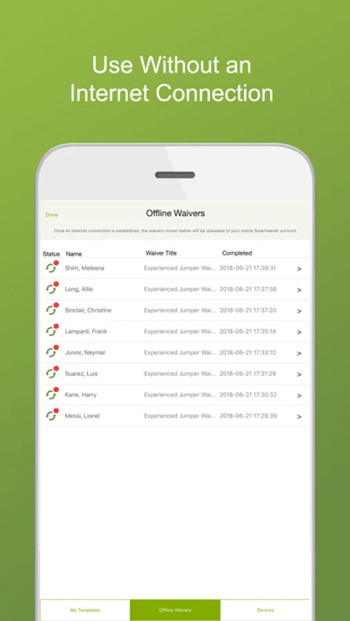 - Allows you to accept digital waivers OFFLINE. Once a data connection is established, offline waivers are automatically uploaded to your account in the cloud.