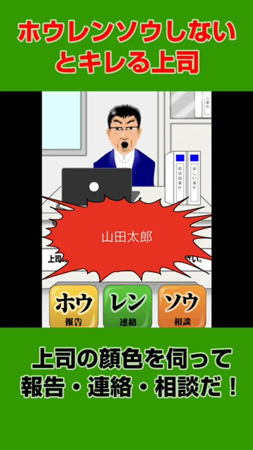 このゲームはタイミングよく上司にホウレンソウすることで評価を得て年収をアップしていく自分育成ゲームです。