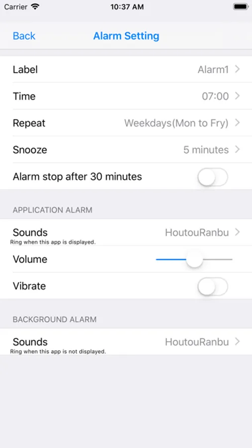 …… 30 minutes after the alarm sounds, the alarm is forcibly stopped. When the app is locked, an alarm sounds every 5 minutes from the set time, and after 30 minutes, the alarm is forcibly stopped. When snooze is set, an alarm sounds every 5 minutes after the snooze setting time, and the alarm is forcibly stopped after 30 minutes have passed.