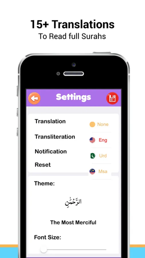 • Surah translation available in 17 + languages including English (Sahih), Urdu (Junagarhi), Malaysian, Bengali, Indonesian, Persian, Spanish, French, Netherlands/Dutch, Italian, Chinese, Hindi, Arabic, Turkish, Russian, Japanese, Portuguese, Thai.