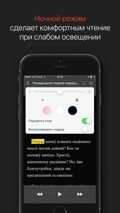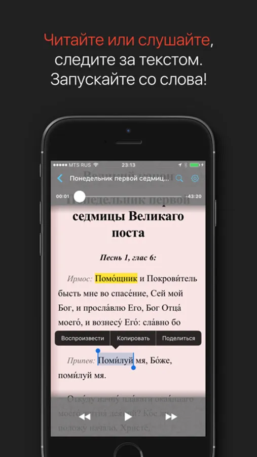 ・Воспроизведение с выбранного слова при помощи долгого касания;