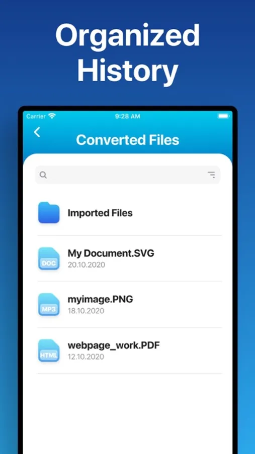Save, Share or Open your converted files in your favorite apps immediately. Browse your previously converted files with our in-app file browser.