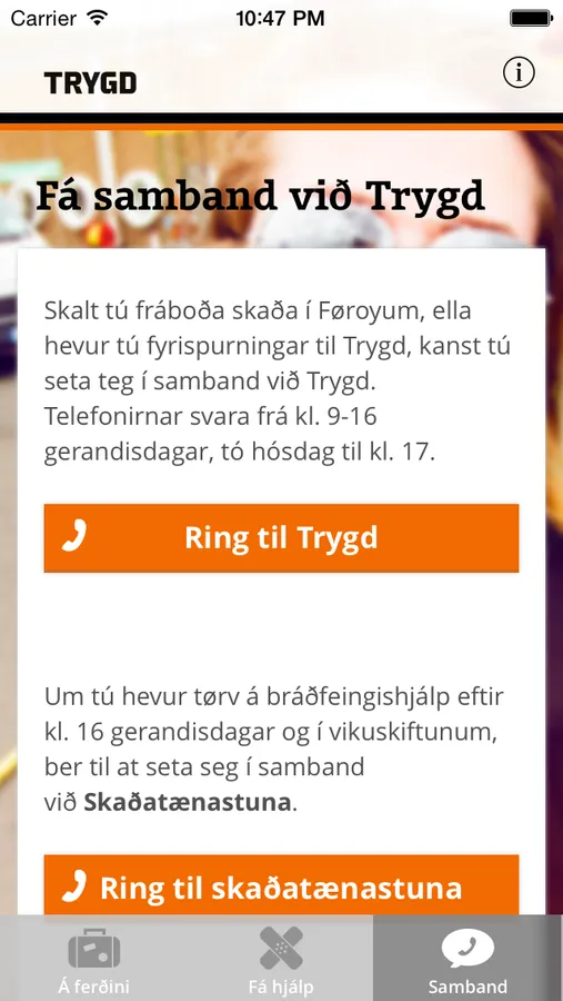 Ætlanin við hesi app er, at viðskiftafólk hjá Trygd kunnu fáa vegleiðing um, hvat tey skulu gera í ymiskum støðum, tá tey eru á privatum ferðum uttanlands – eitt nú um tey gerast sjúk ella teirra viðføri er seinkað.