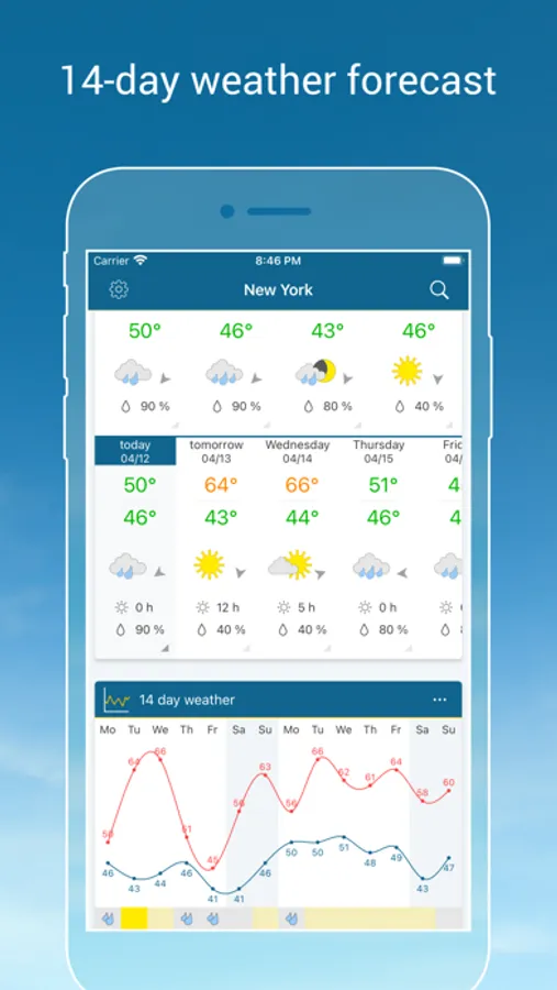 The latest forecasts for temperature and wind, chance of rain or snow, sunshine duration and UV levels. Detailed data on air pressure, dewpoint, feels-like temperature, wind chill and air pollution. Plan further ahead with the 14-day weather trend.