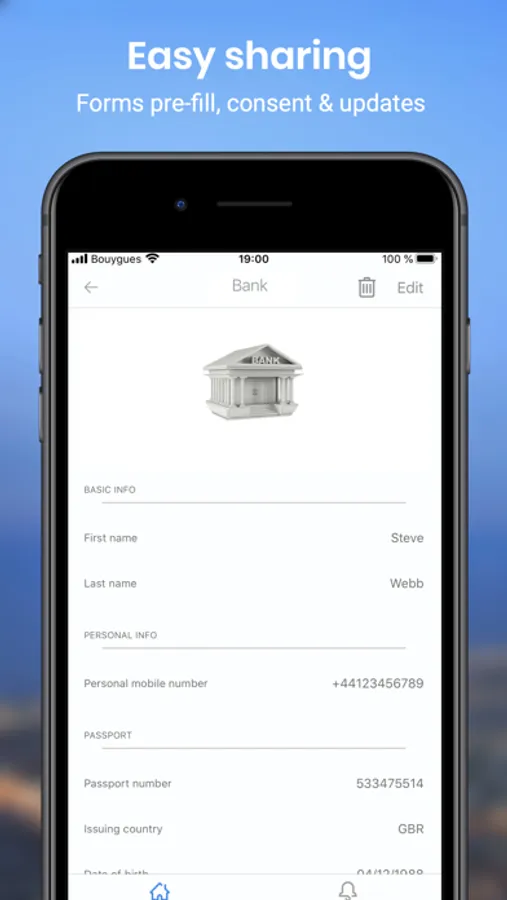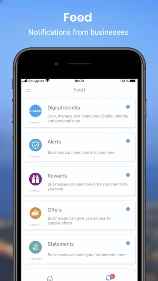 As a user (Individual or Director of a Corporate), the Chekk Mobile app enables you to securely scan, store and manage your personal data (eg., passport, ID card, driving licence, bank and insurance details...), create personal profiles combining data (eg., Bank profile with ID, accounts and policies details; Travel profile with passport, hotel and frequent flyer cards), and share these with others by granting access to your data. It makes your life easier when you need to look up for your data to fill a form or share some of these with a business (eg., bank, travel agent...) And it’s also a central place for you to receive messages (eg., offers, alerts, statements) from the businesses your interact with.