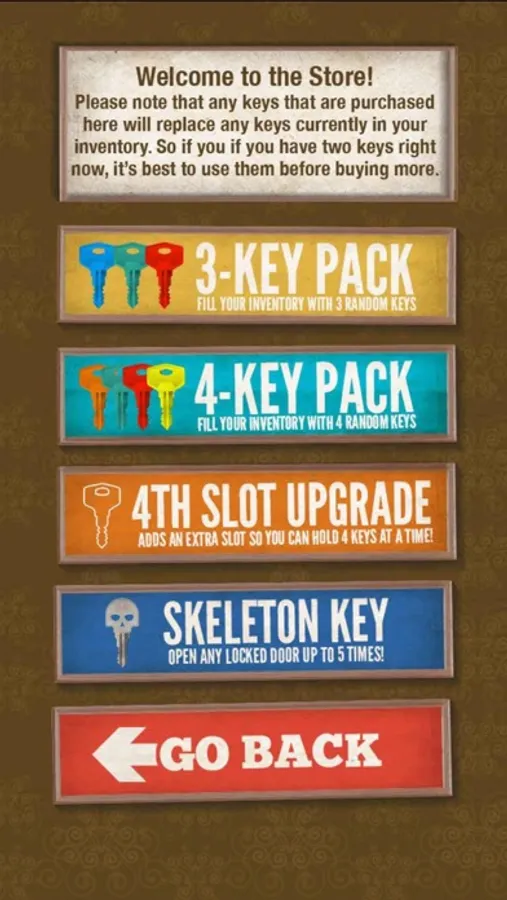 The Skeleton Key: This is a very special key that requires the 4-solt upgrade. Once you have a Skeleton Key, you can automatically unlock any locked door if you don't already have its key. The best part is, the Skeleton Key lasts for five unlocks!
