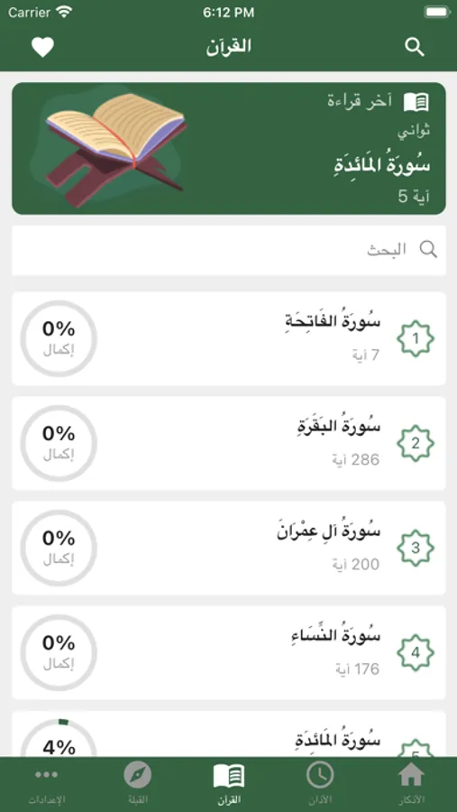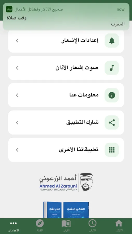 The application, after the eighth update, includes the correct Azkar, prayer times, the direction of the qiblah, and the simplified Qur’an for reading, which includes the simplified interpretation of Saadi, as well as English translation and parsing.