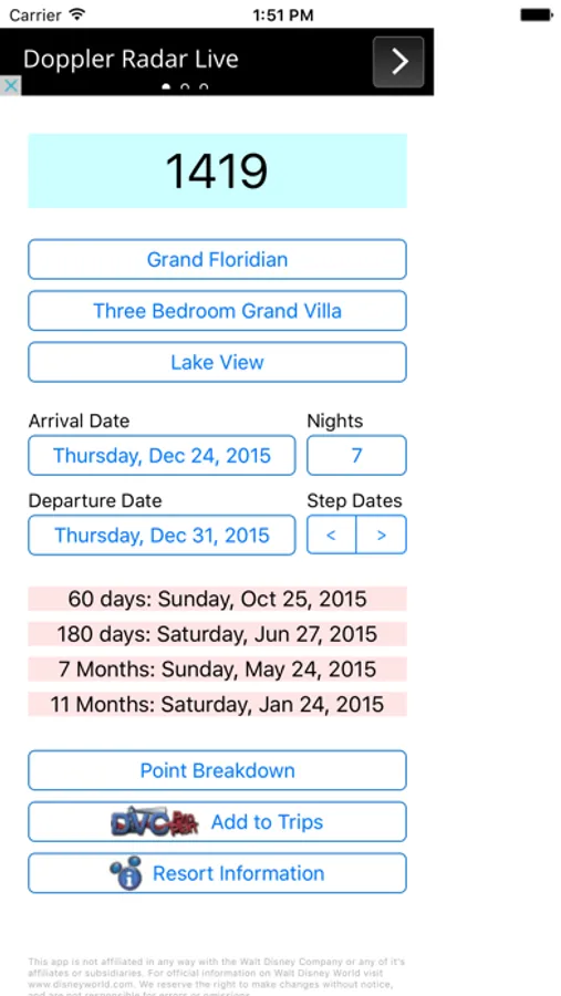 Calculate DVC points for specific dates based on the resort, room, and view.