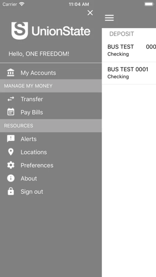 •Check balances, transfer money between Union State Accounts, and locate ATMs/banking centers3