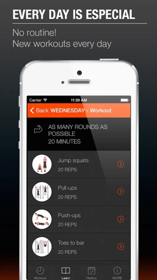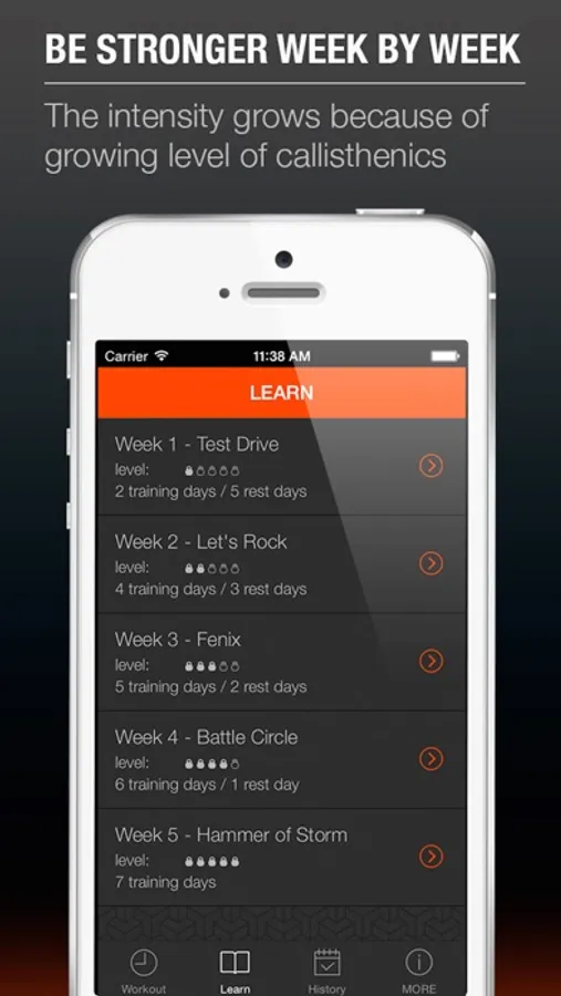 This app includes balanced course of exercises for every day. It was developed by professionals with a great experience which they gained in sport and fitness for many years. All you need to do is to push "start" and follow the instructions. From week to week the intensity will be growing because of growing level of callisthenics. The app is good for both beginners and people who know what is "interval workout", "tabata workout" not by hearsay.