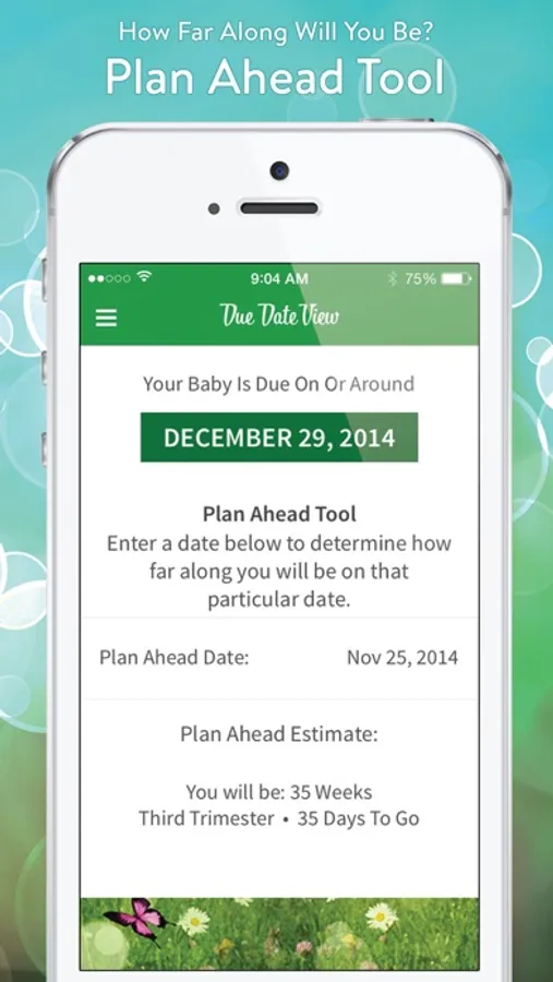 Introducing the Plan Ahead tool, a unique feature that allows you to see how far along you will be in your pregnancy on a particular date. Simply tap the “Plan Ahead” button on your Due Date View screen and enter the date you are inquiring about. Based on your due date estimation, the Plan Ahead tool will estimate how many weeks, days, the trimester you will be in and how many days you have left to go in your pregnancy on the date you entered. This is invaluable when planning around holidays, travel, doctor’s visits, events, and more!