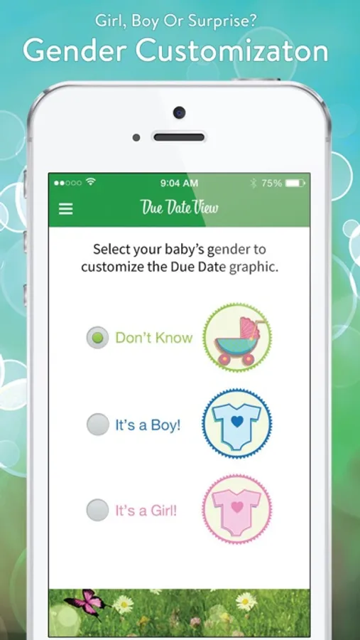 Gender Customization is available by tapping the “Gender” button on your Due Date View screen. You may select “Don’t Know” and keep a gender-neutral icon on your screen or choose “Boy” or “Girl” to have a blue or pink onesie displayed. If you selected a gender and would like to change it, tap the “Clear” button on the Due Date View screen and re-enter the information.