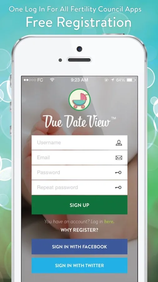 Due Date View, which is part of the Fertility Council network of apps designed specifically for women, gives you the option to register free. Once you register in any Fertility Council app or web site, your username and password will work on any of them. In addition, once you are logged in, key data points are shared across all apps so you only need to enter them once. For more information download the app or visit FertilityCouncil.com.