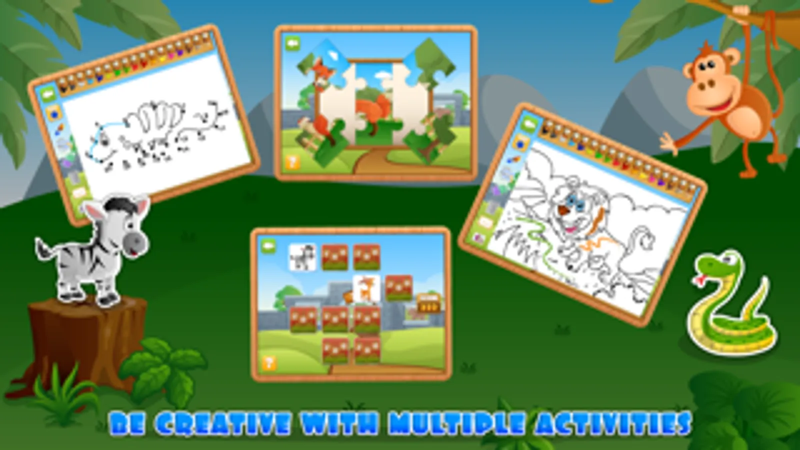 Open the app and let your kids choose between jigsaw puzzles, memory match games, connect the dots games and coloring! Your little toddler will have fun and learn at the same time with these engaging animal games! Suited for all girls and boys, this educational app is perfect for kids and encourages early learning while bringing loads of fun!