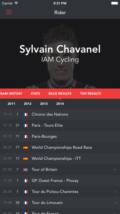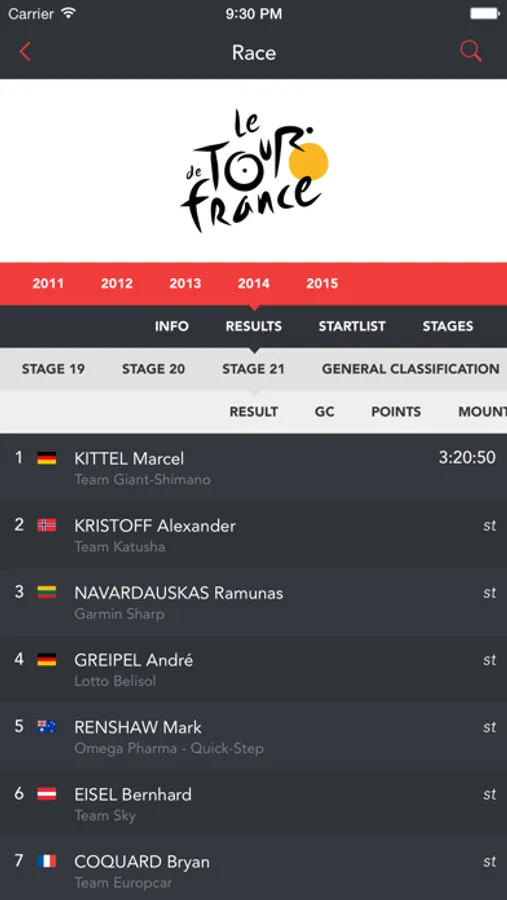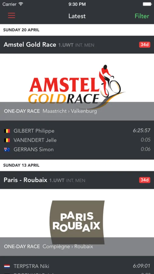 - Follow specific riders, teams and races and get the results in a feed