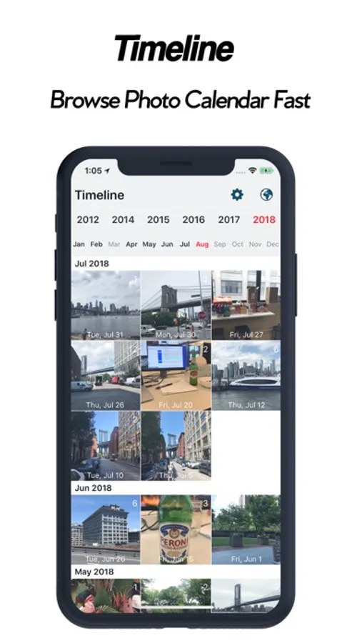 Map view shows all your photo on a world map, search location to navigate map, tap map photo cell to see all photos taken at that place. You can easily browse all your photo under timeline.