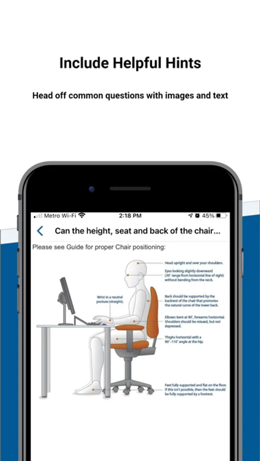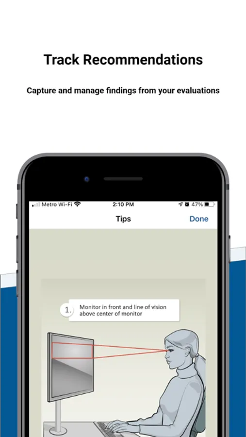 The SBN Ergonomic Evaluation Tool allows users to assess computer workstation setup. The application provides specific recommendations for users on how to enhance their workstation in order to minimize discomfort and risk of injury. Designed by veteran ergonomic specialists, the application automatically generates real-time recommendations that can be shared immediately with the computer user or sent to a specialist for additional review. In addition, the tool provides ergonomic best practices and stretches in order to maximize the comfort of your employees. The tool is ideal for orientation and setup of computer workstations, response to discomfort while using the computer, tracking evaluations throughout an organization, and for evaluations of remote workers.
