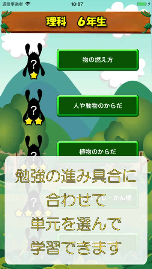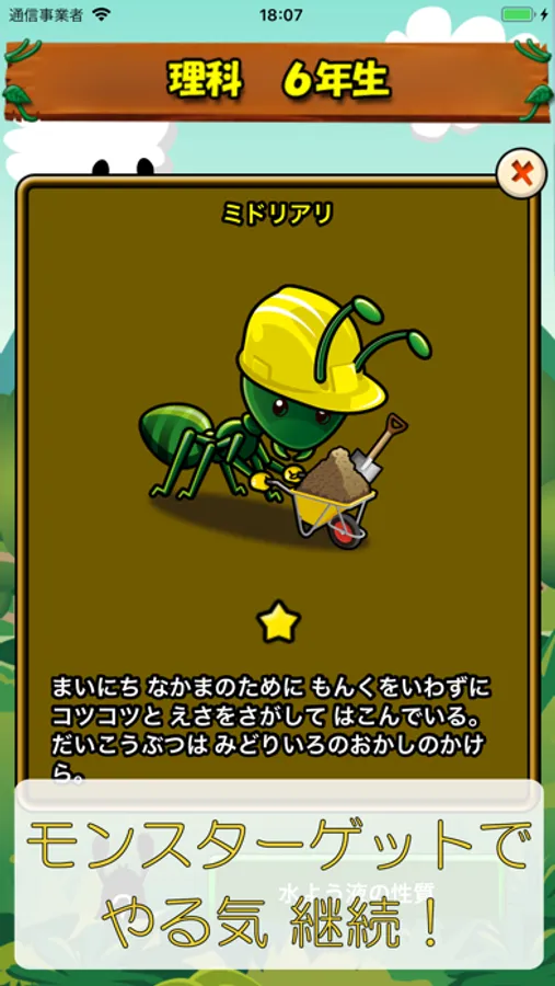 小学校6年生の理科アプリの決定版!学習の進み具合に合わせて単元を選択して、効率的に復習できます。4択のクイズ形式という使いやすさ、勉強のご褒美にモンスターを集めていく楽しさで、子供が継続的に勉強します。(iPad、iPhoneの両方に対応)