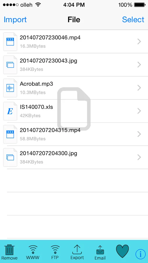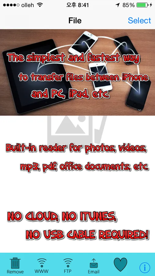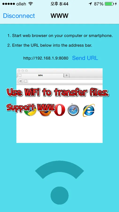 Using this app and WiFi network, you can wirelessly transfer files between your iPhone and another devices such as PCs and smartphones which support WiFi.