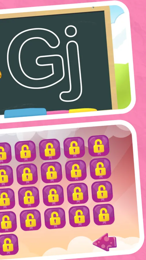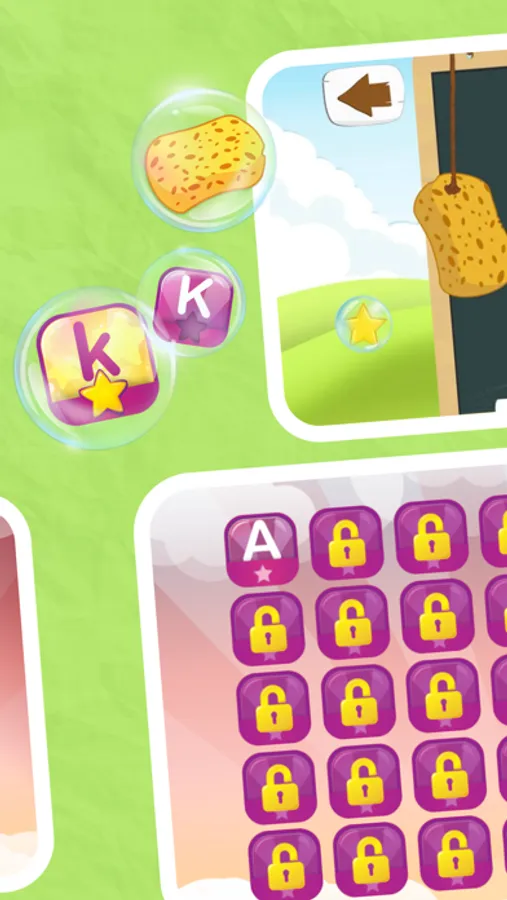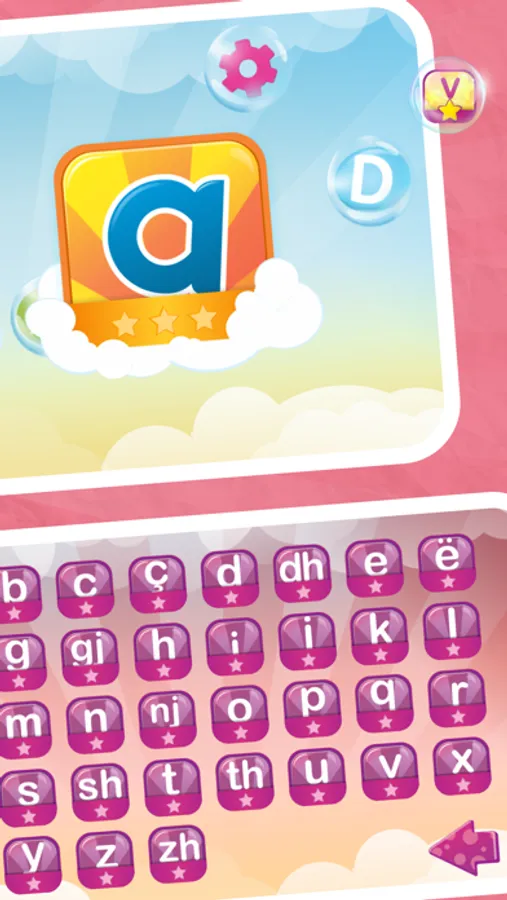 - Shkrimin e shkronjave në tabelë të zezë me katër ngjyra të ndryshme, ku nëse shkruan shkronjën si duhet atëherë merr 3 yjet maksimale, ndërsa nëse gabon mund të përdor shpuzën për fshirje.