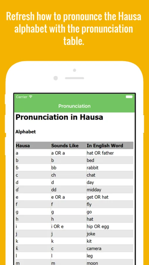 Refresh how to pronounce the Hausa alphabet with the pronunciation table.