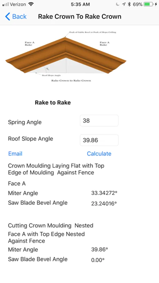 Crown Molding Tools is an iPhone app with functions to calculate complex crown miter and bevel angles that other calculators don't offer.