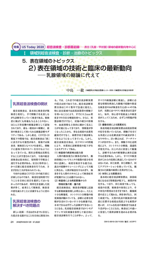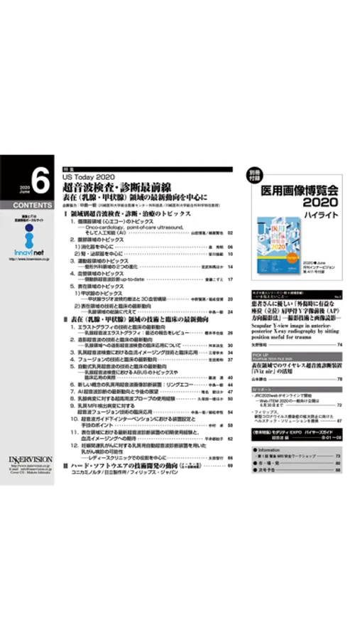 1986年創刊の「月刊インナービジョン」は,医療と画像の総合情報誌として高い知名度を誇り,臨床現場に不可欠の存在と評価されています。臨床現場に密着し,先見性を重視した編集方針のもと,再現性に優れる美しい誌面,一歩先を見通す企画力,卓越した取材力などが特徴です。画像診断,放射線治療,医療情報システム,医療経済に至るまでの幅広いテーマで,タイムリーな特集をはじめ,注目のモダリティや技術を取り上げる取材記事や連載記事など,日常診療にすぐに役立つ情報が満載です。毎月5日に最新号を配信します。
