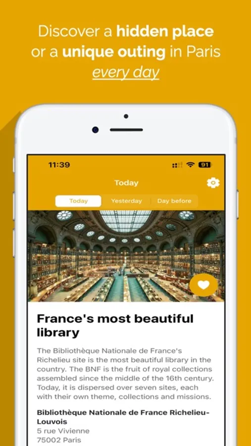 Secrets de Paris is the first app that lets you discover every day a novel and inventive hidden treasure of the world's most beautiful city. The most beautiful rooftops, the secret passageways, the quirkiest streets and monuments, restaurants built around fun and innovative concepts, unexpected boutiques...