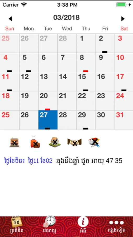 Khmer Fengshui Calendar 2018 gives details day to day auspicious/inauspicious(good/bad) prediction for important events based on Chinese Annual Almanac plus Chinese Feng Shui.