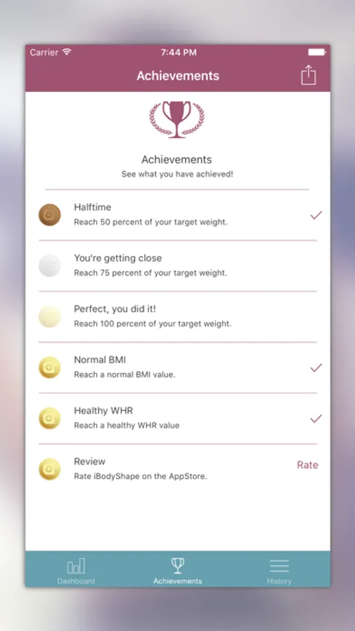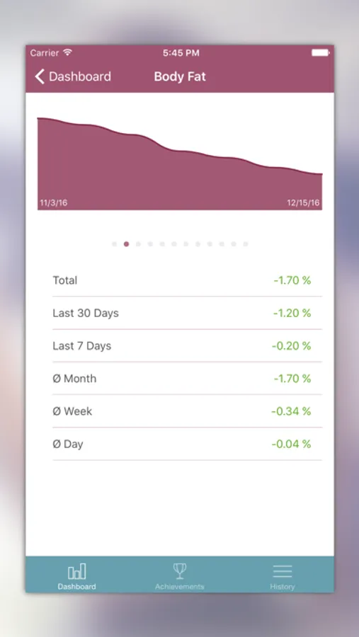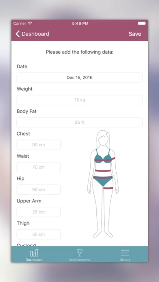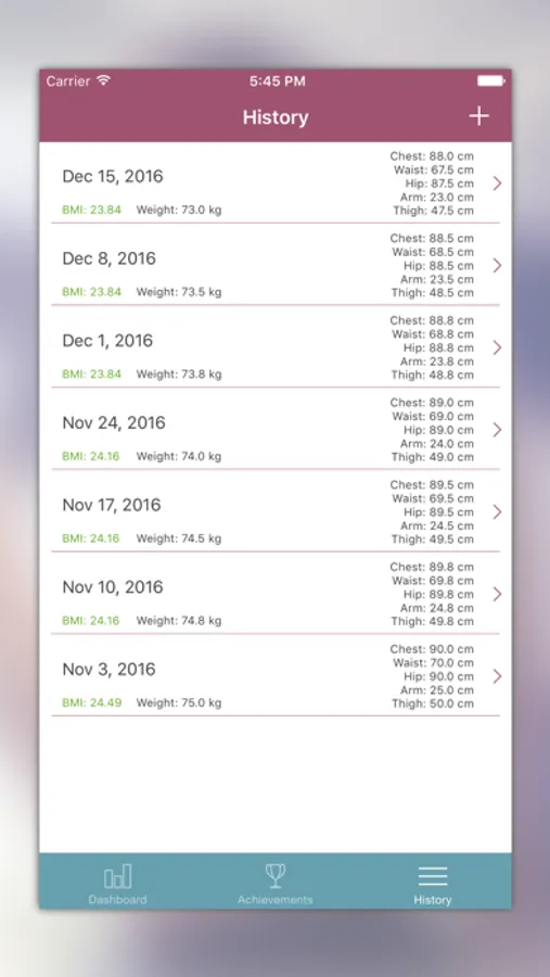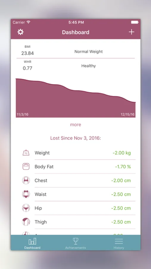 All data is clearly displayed on the dashboard. By entering your body measurements and your weight, BMI (Body Mass Index) and WHR (Waist to Hip Ratio) is calculated and evaluated. You can also see the progress of your weight on a chart.