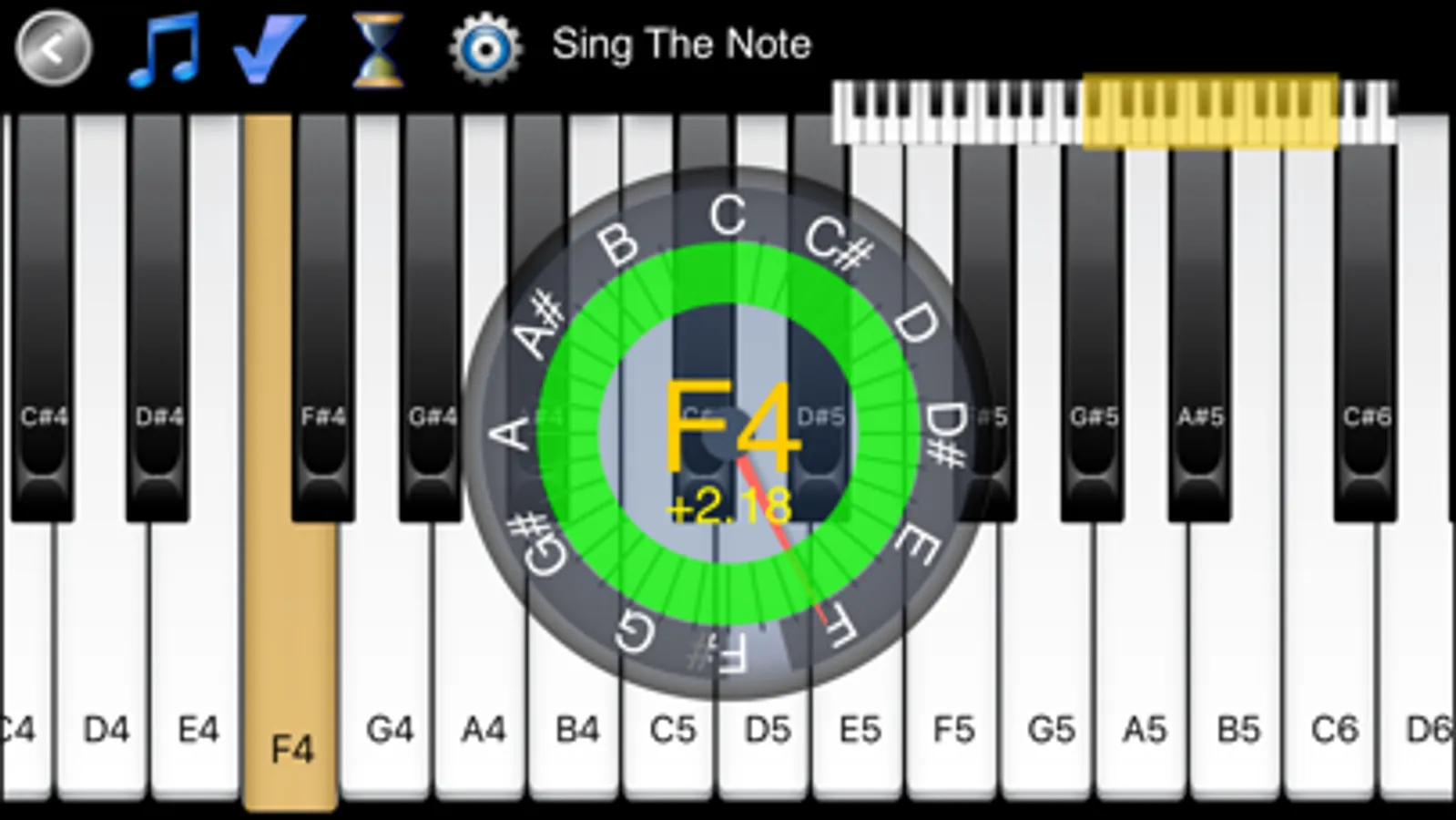 • The piano keys highlight showing which note you should sing and which pitch you are correctly singing.