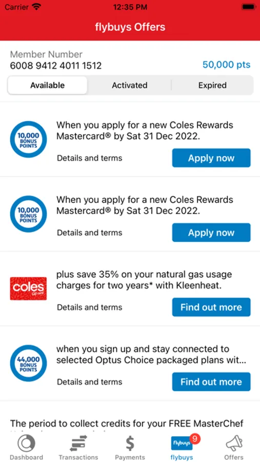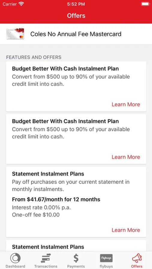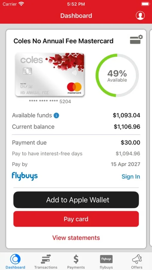With access to your account balance, available credit, transactions and statements, you can also make payments, set up push notifications, view your Flybuys points balance, access offers and Cash and Statement Instalment Plans as well.