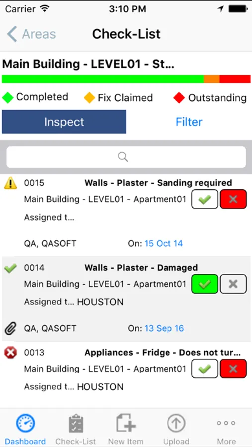 Use your mobile device to inspect every element of the project at any stage of the project using a standardised project inspection list to ensure that comprehensive inspection is carried out. Record defects noticed and either automatically or manually assign the responsible person/organisation who needs to fix the defect and the required fix date. Also attach a photographs and mark them up or use an AutoCAD drawing to pinpoint the defect location.