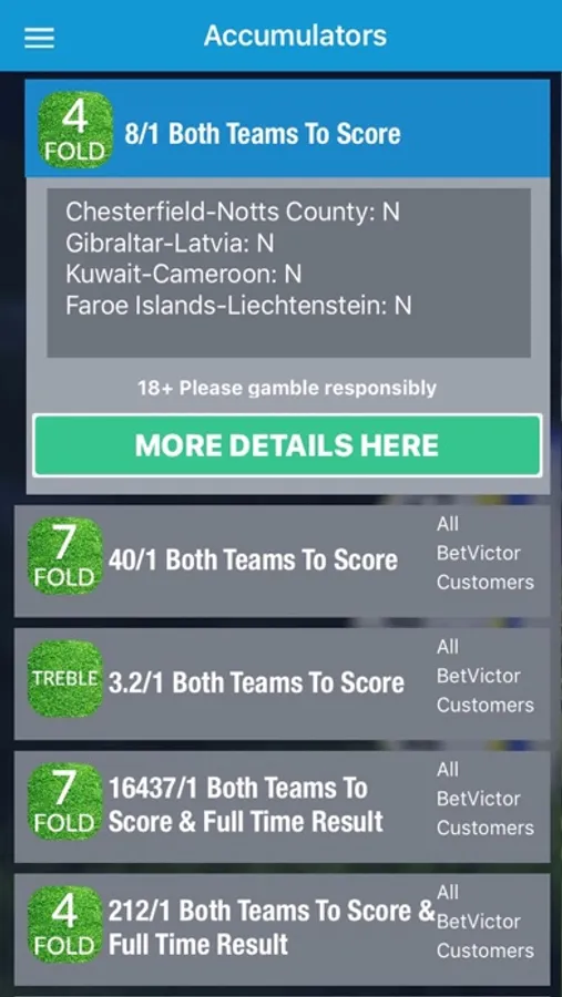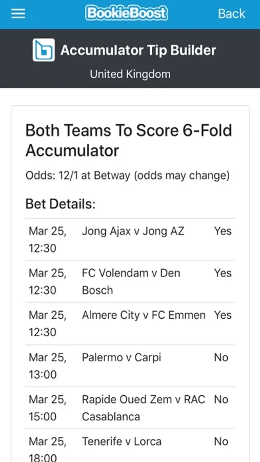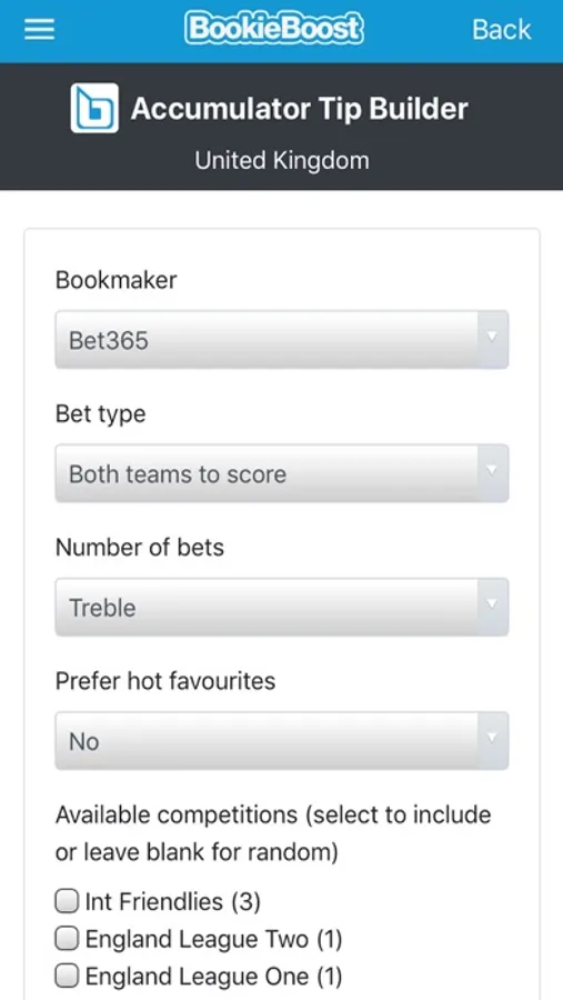 The app also features the Acca Tip Builder tool which allows you to finetune your accumulator tips by selecting a bookie, bet type (e.g. treble, 4-fold up to 10-fold) and which football competitions to include.