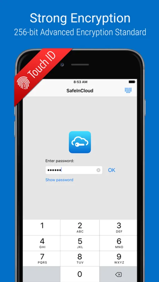 You can instantly unlock SafeInCloud with a fingerprint on devices with Touch ID. You can also unlock SafeInCloud by face recognition using Face ID technology.