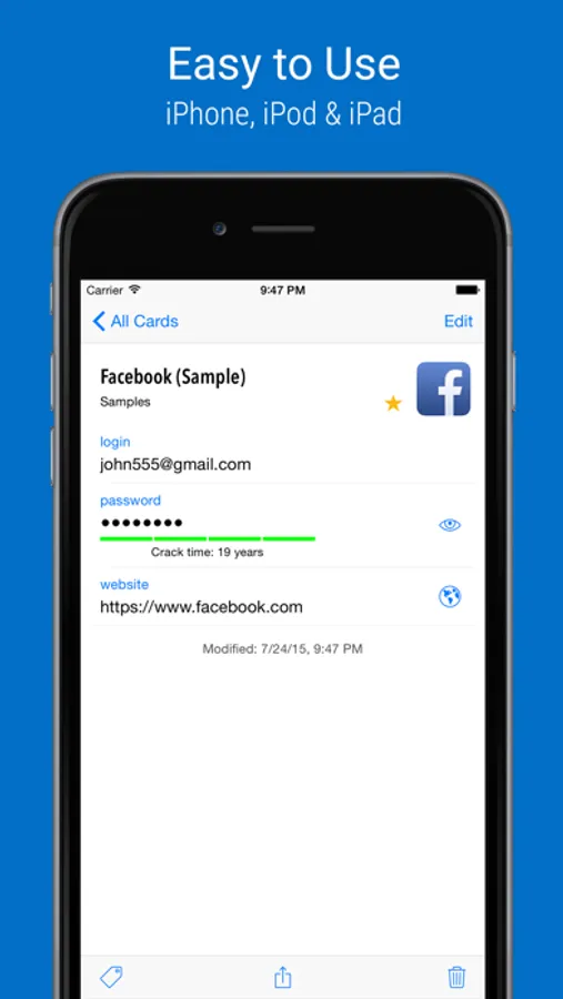 SafeInCloud Password Manager allows you to keep your logins, passwords, and other private info safe and secure in an encrypted database. You can synchronize your data with another phone, tablet, Mac or PC via your own cloud account.